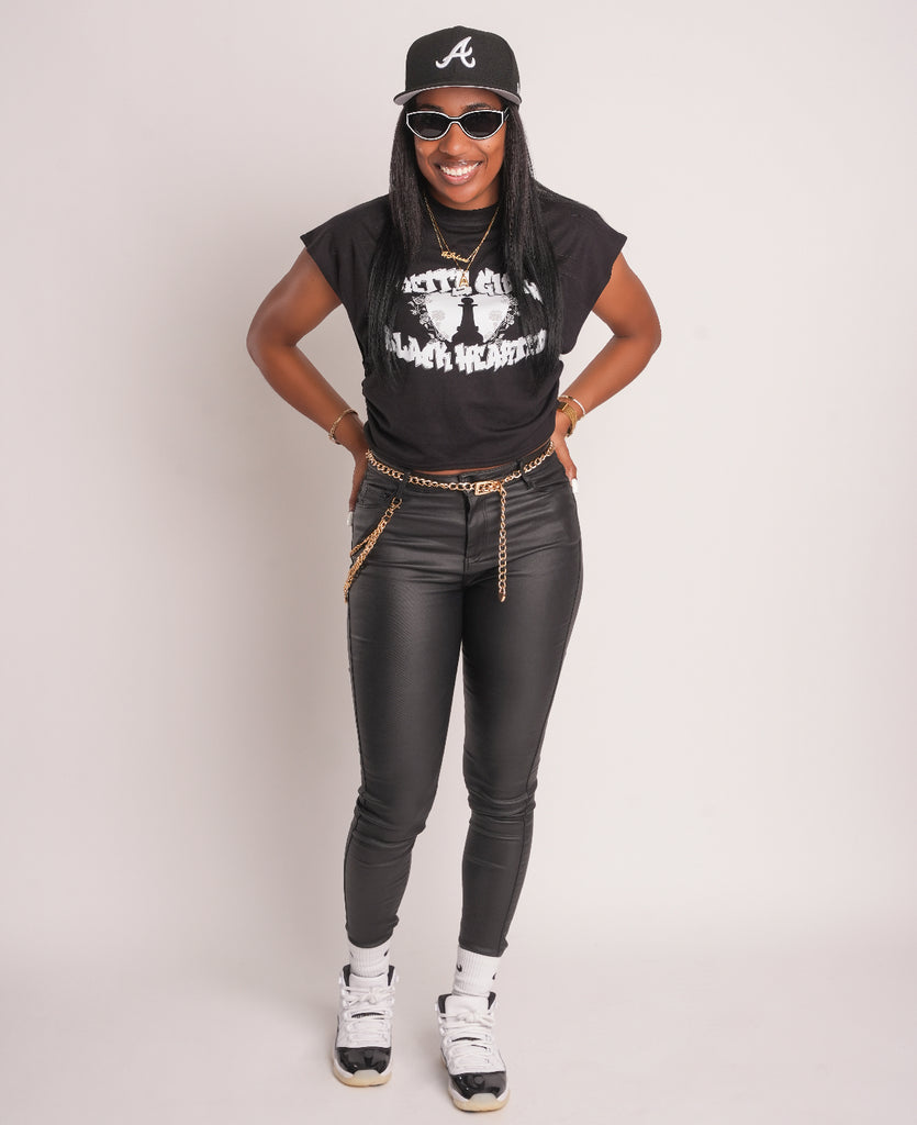 Make a bold statement with this edgy black sleeveless crop tee featuring a distressed streetwear vibe. The front graphic showcases a shattered heart with a silhouetted figure and roses, framed by bold gothic-style lettering that reads "Pretty Girls Black Hearted." Crafted from soft, breathable cotton, this top pairs effortlessly with high-waisted jeans, cargo pants, or your favorite kicks. Whether you're channeling street chic or laid-back cool, this crop tee is your go-to for turning heads and showing off your unapologetic attitude.